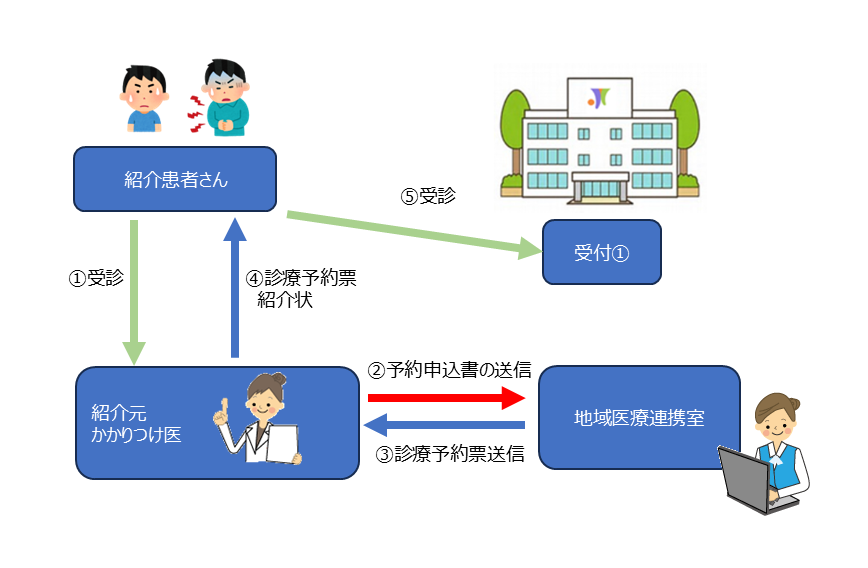 御紹介いただく際は、外来診療担当医表をご参照ください。 - 申込を頂いて、10分~15分で「診察予約券」をFAXにて送らせていただきます。※血液内科、消化器内科、糖尿病・内分泌・代謝内科・腎臓内科の予約調整は時間を要しますのでお返事が後日になる場合がございます。